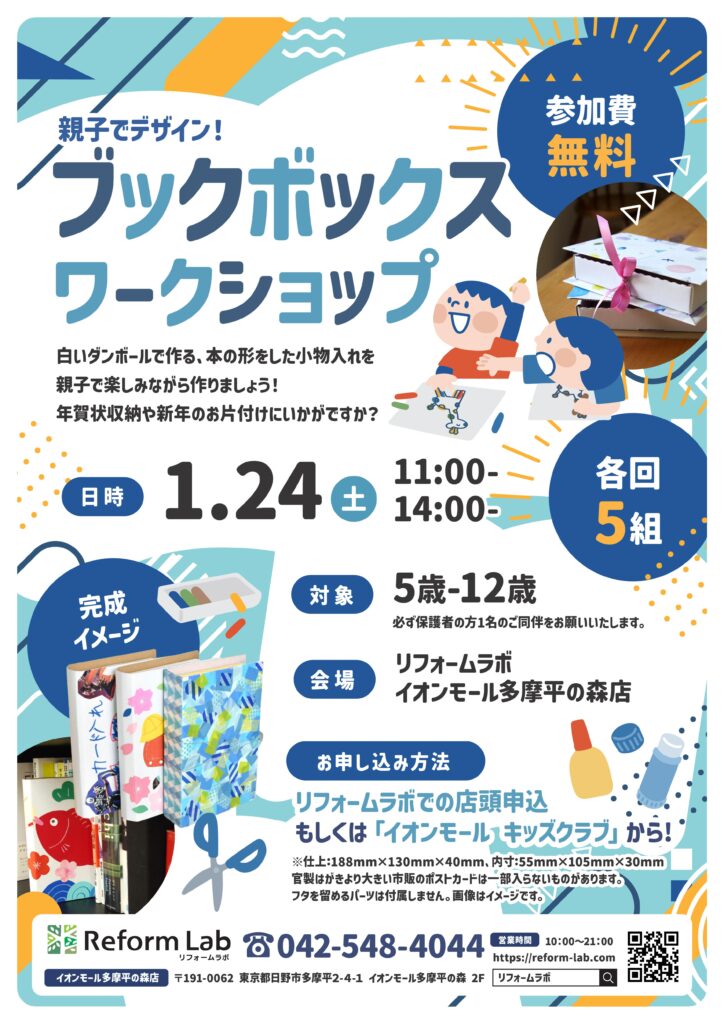 お知らせ 小さな収納『ブックボックス』を作ろう! 親子で楽しめるキッズワークショップを開催します。自分だけの「ブックボックス」を作る楽しさはもちろん、完成後は小物入れとしても使える実用的なアイテム。親子で一緒に、ものづくりの時間をお楽しみください。