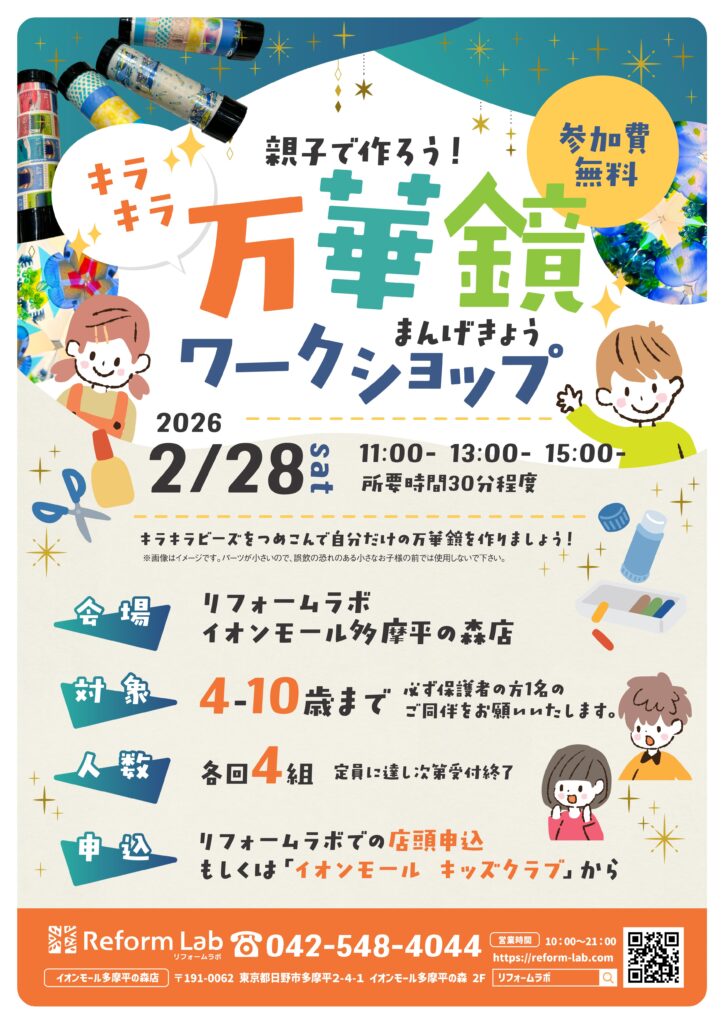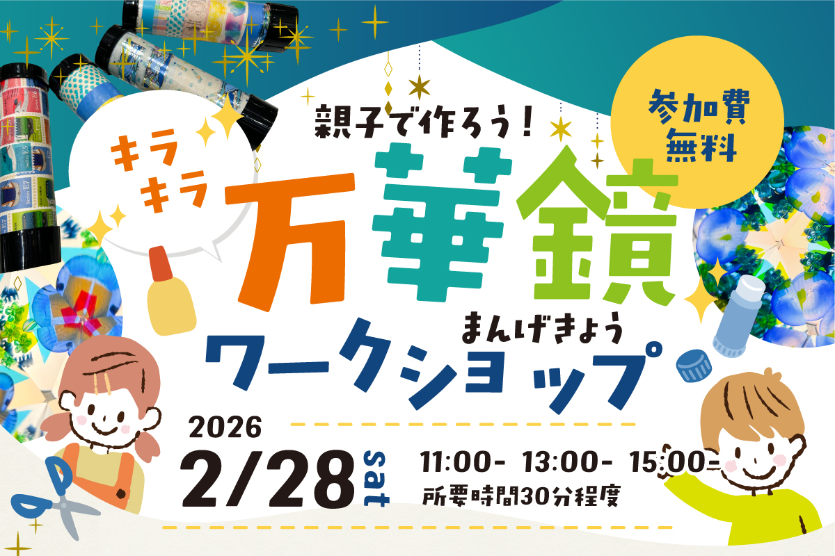 お知らせ キラキラ『万華鏡』を作ろう! 親子で楽しめるキッズワークショップを開催します。色とりどりの素材を使って、自分だけの「万華鏡」を作ります。くるくる回すたびに変わる幻想的な模様を楽しみながら、親子で一緒にものづくりの時間をお過ごしください。