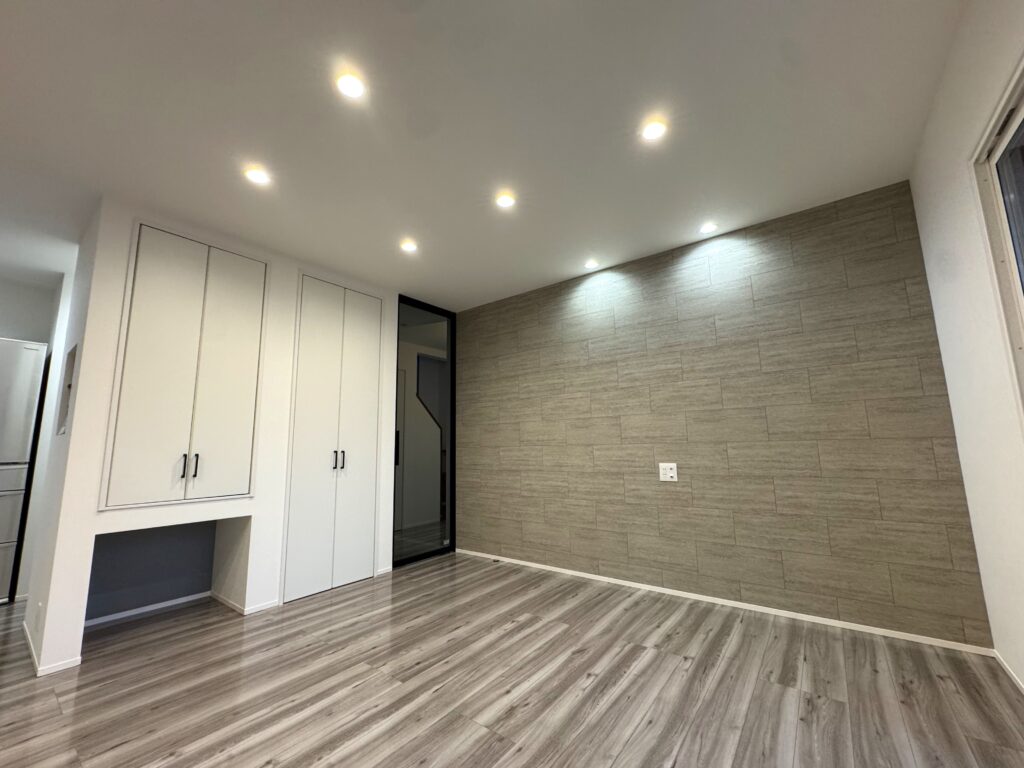 ・思いきって窓をなくし、壁一面にタイル調アクセントクロスを採用。お部屋の印象がぐっと引き締まり、落ち着いた雰囲気に仕上がりました。 -