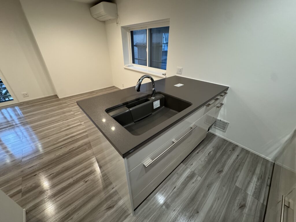 ・キッチンのワークトップは、床やアクセントクロスとトーンをそろえ、空間全体に統一感のあるスタイリッシュな印象に仕上げました。 -