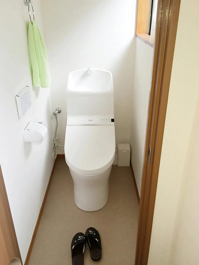 トイレは最新式のものに取り替え、壁紙もシンプルなものにして清潔感を出しました。 -