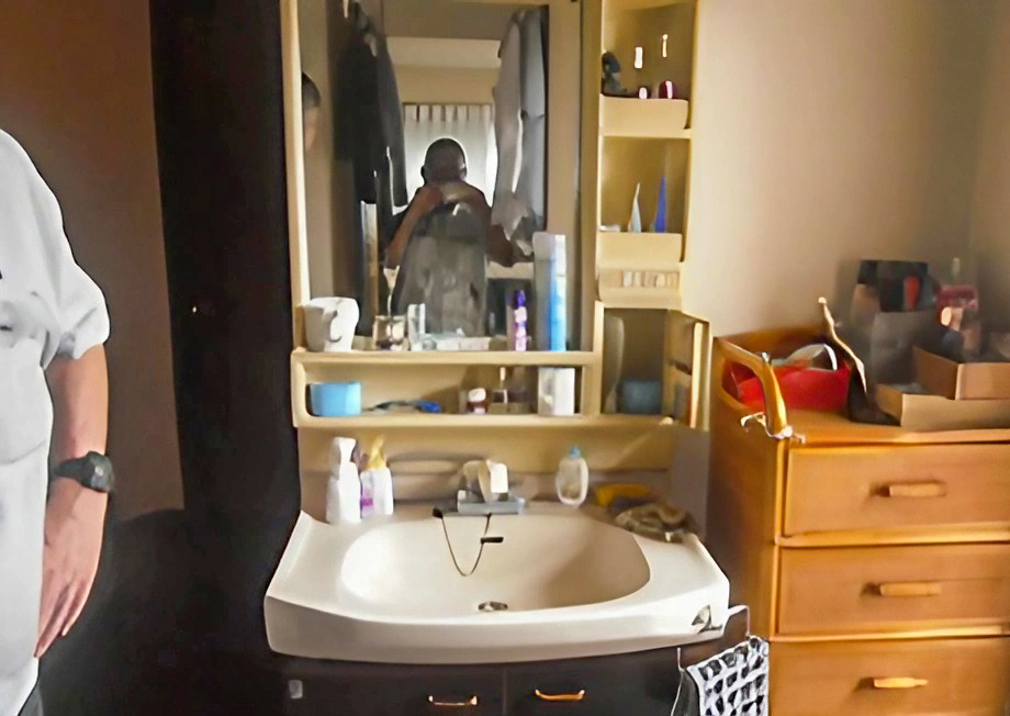 年季の入った洗面台の棚は黄ばんでいました。 -