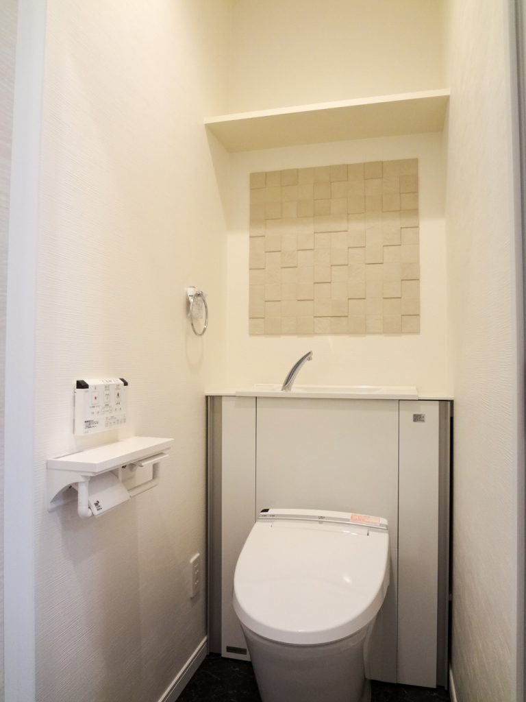 トイレの後ろには収納棚を設置し、掃除グッズなどをすっきり収納することができます。 -