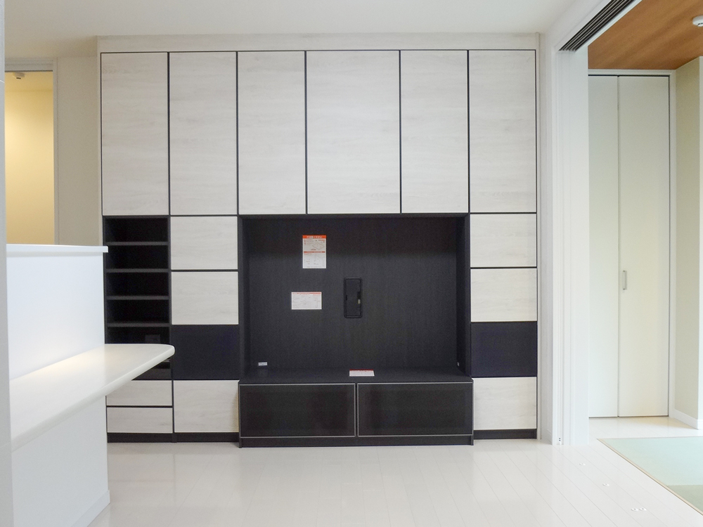 清潔感のあるお部屋になりました。白い空間に設置された黒いテレビボードがお部屋のいいアクセントになっています。 -